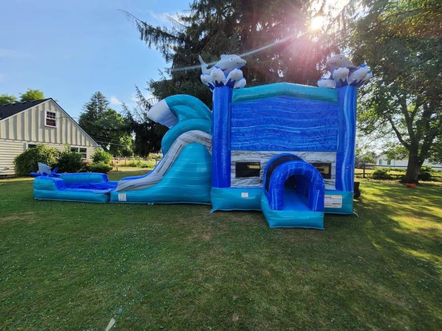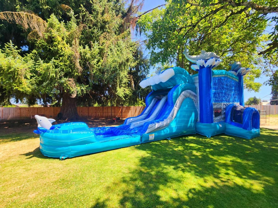 Introducing the XL-Dolphin Dual Water Slide Combo, the perfect addition to your next outdoor event or party! This colorful and exciting bounce house water slide combo is guaranteed to provide hours of fun and entertainment for kids of all ages.